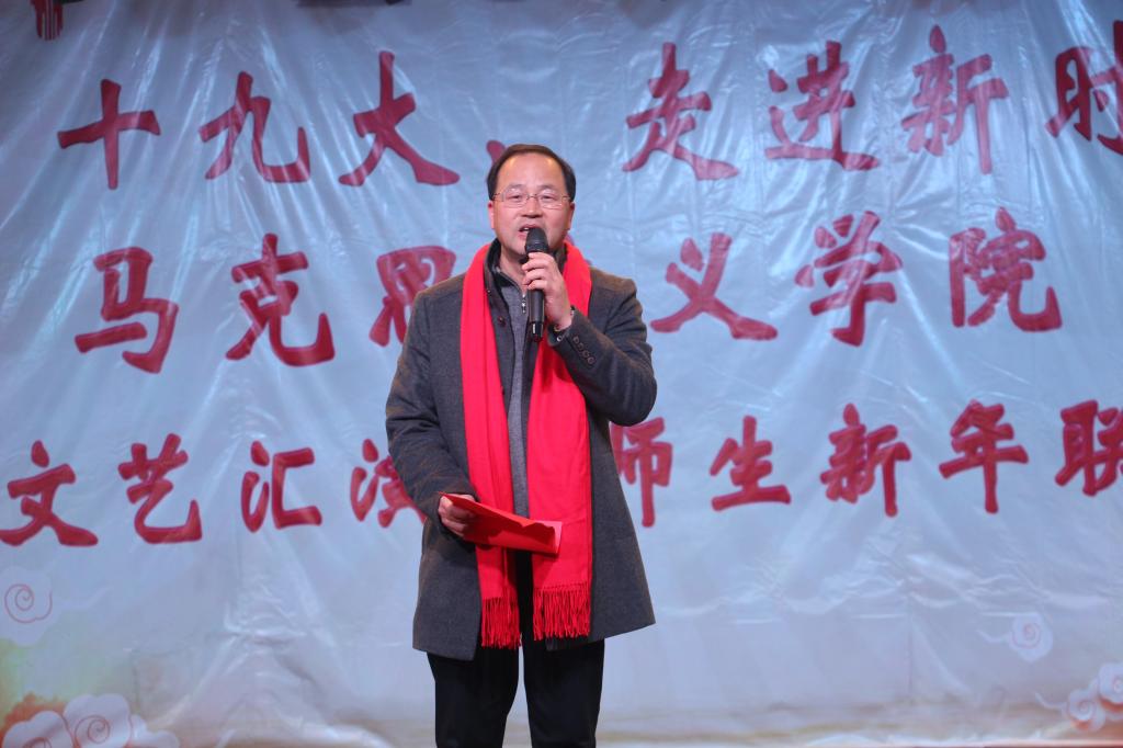 晚会在马克思主义学院政治理论教研部带来的《伟人诗篇,毛泽东诗词》深情朗诵中拉开帷幕;紧接着,到场领导为我院优秀老师们颁奖并表示祝贺。之后,何光彩书记为本次晚会致辞,他对我院2017年取得的成就表示肯定和衷心的祝贺,并祝愿我院在2018年能取得更好的成绩。