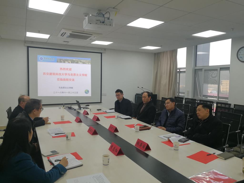2018年11月23日下午,西安建筑科技大学马克思主义学院党总支书记杨航征一行来我校开展调研。学院党委书记刘世勇、副院长张存国、阮一帆以及孙文沛、胡雪黎等老师参加调研座谈会。座谈会由刘世勇书记主持。
