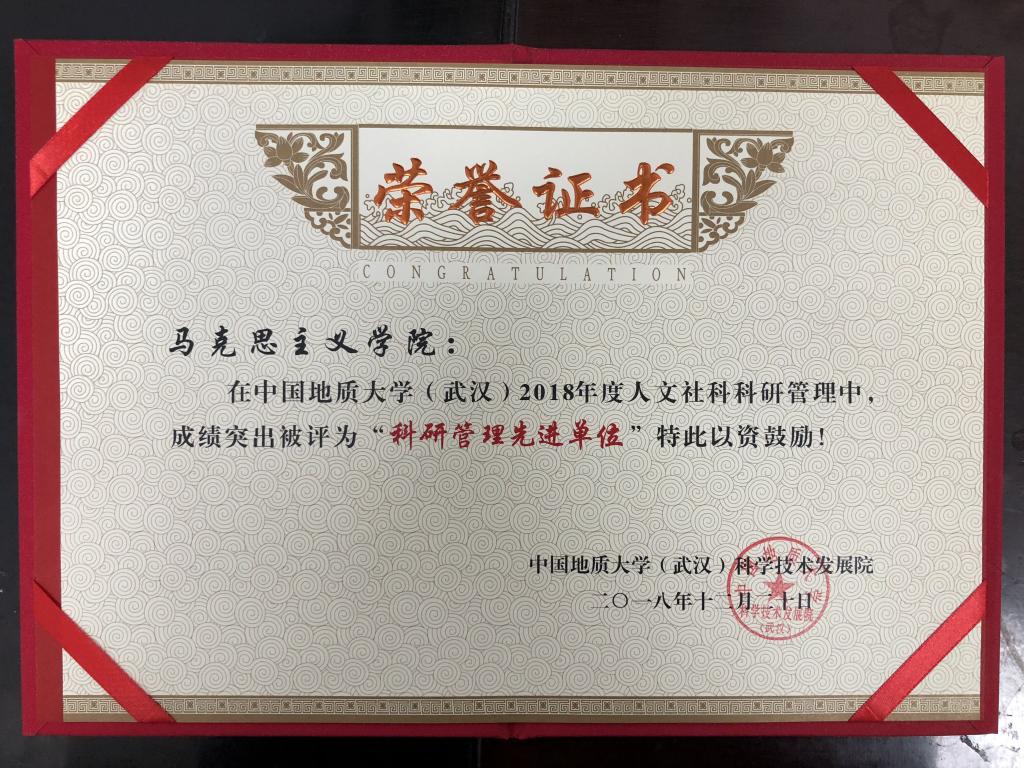 近日,从中国地质大学(武汉)2019年国家社科基金申报动员大会暨2018年社科科研管理先进单位和个人表彰大会上获悉,我院获评2018年社科科研管理先进单位,我院科研秘书获评科研管理先进个人