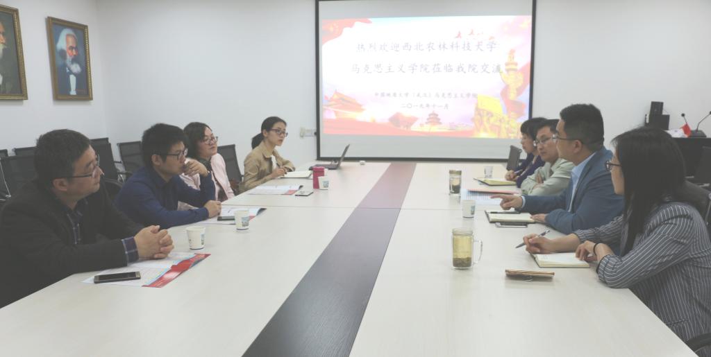 (通讯员 胡雪黎)2019年11月4日,西北农林科技大学马克思主义学院院长邓谨、副院长王海成等一行来我院开展招聘宣讲与调研。学院党委书记刘世勇、副院长陈军、政治理论教研部支部书记郭关玉、院办主任胡雪黎以及部分研究生参加了座谈会。座谈会由刘世勇主持并对邓谨院长一行的莅临表示欢迎。